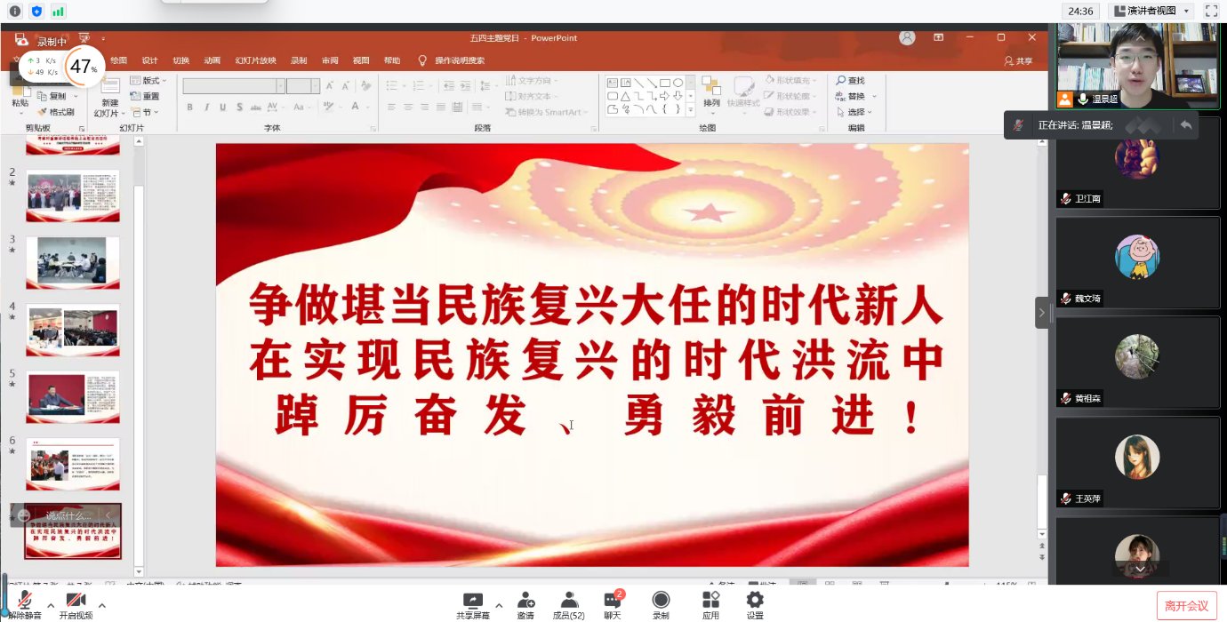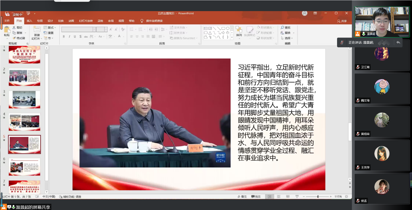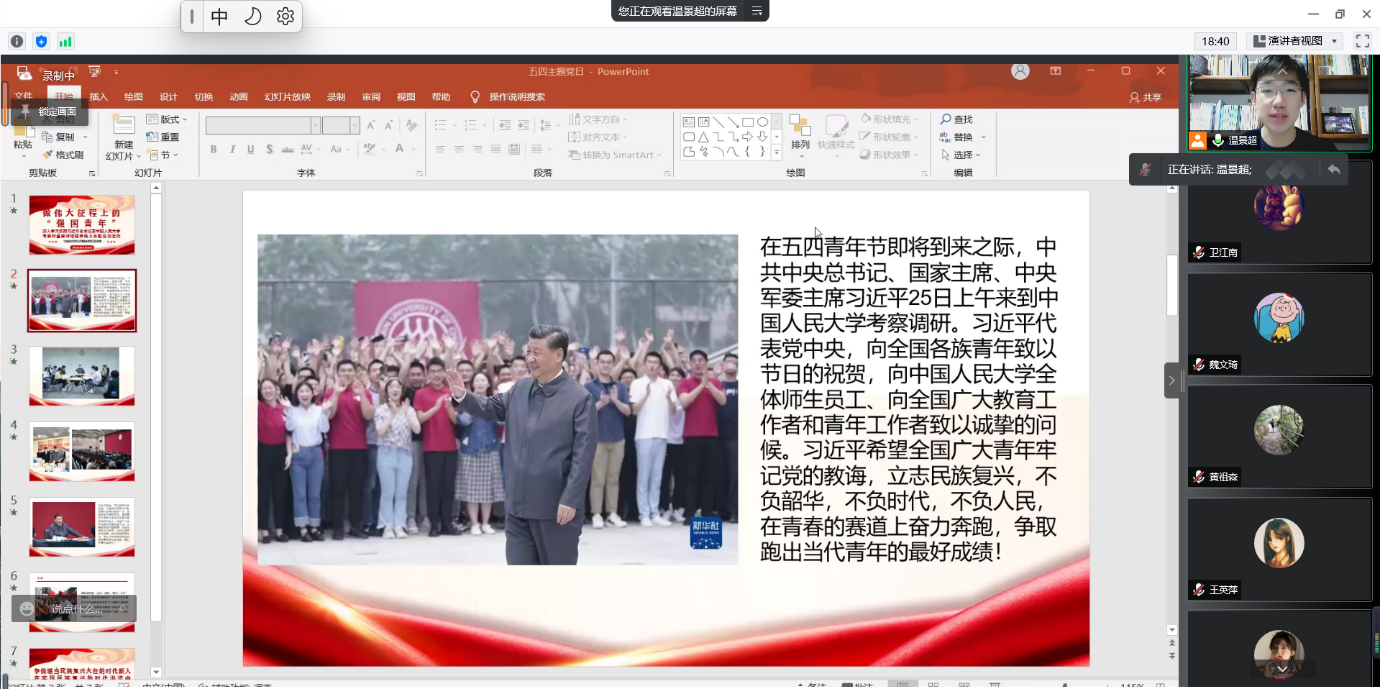 最后,温景超总结道,各位同学虽然已经是党员或预备党员的身份,但绝大多数同学也保留着团员的身份,因此我们的身份是比较特殊的,我们身上的担子和意义也是特殊的。我们既要贯彻和发扬党的指示,也要学习和践行团给我们的指示。我们承担着点亮一盏灯,照亮一大片的职责,各位党员同学要努力带动身边的同学一起为中华民族伟大复兴添砖加瓦,这个身份是赋予我们的光荣使命,我们要不断提升理论素养,当好宣传员,把党的理念正确及时传达到身边同学的心中。
