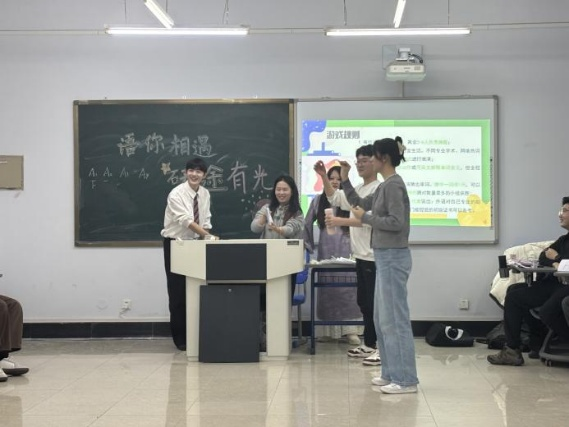 其中,“你划我猜”环节推动气氛进一步热烈起来,各小组通过肢体动作或英语解释单词含义,既考验了同学们彼此间的默契程度,又考验了自身的理解能力和协调能力。“蒙眼互打”环节中,同学们戴着眼罩尝试触碰他人,接续了这一热烈气氛的同时将活动氛围推向高潮。