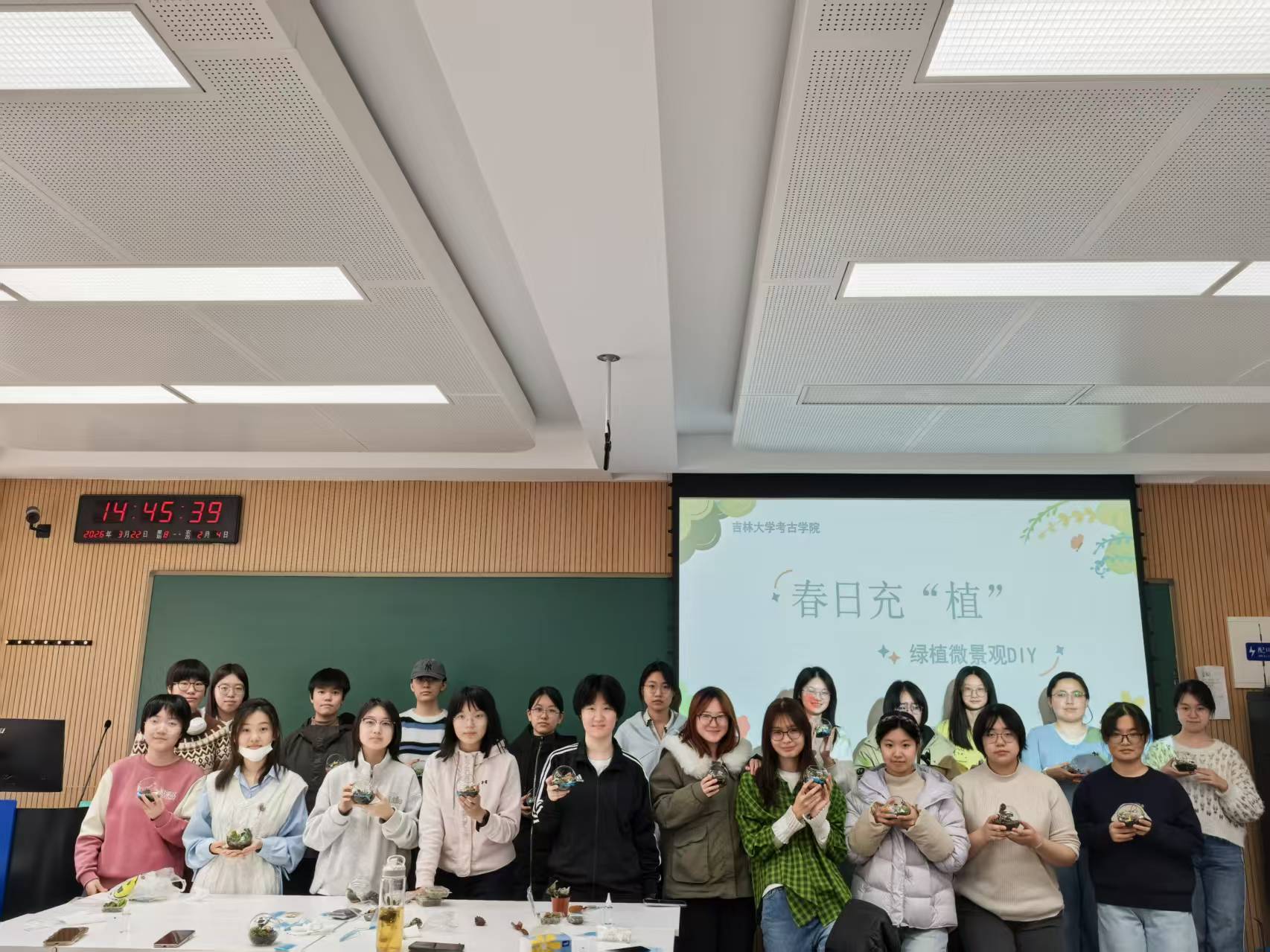 讲解结束后,同学们捧着自己亲手制作的绿植微景观合影留念。此次绿植微景观DIY活动,以园艺疗愈为桥梁,让同学们在动手创作中释放了压力、舒缓了心情、收获了能量,不仅为校园增添了春日生机,更搭建起了学子心灵休憩的温暖港湾。愿这份春日的绿意与温暖,陪伴每一位同学在校园生活中步履不停,奔赴更多美好与精彩。