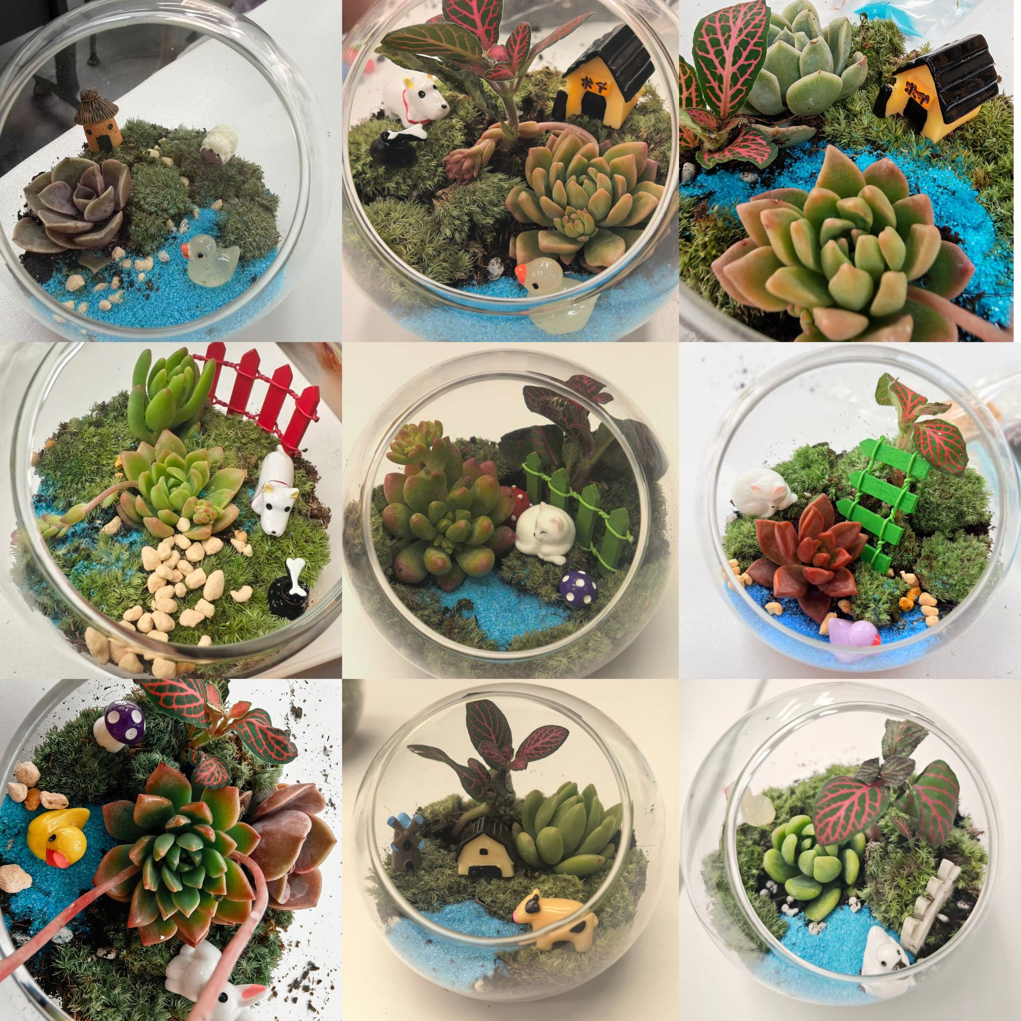 讲解完毕,绿植微景观的创作环节正式开启。同学们充分利用现场准备的玻璃瓶、石子、营养土,以及多肉、苔藓等绿植,搭配各式各样的创意摆件和制作工具,开启了属于自己的春日方寸天地创作。
